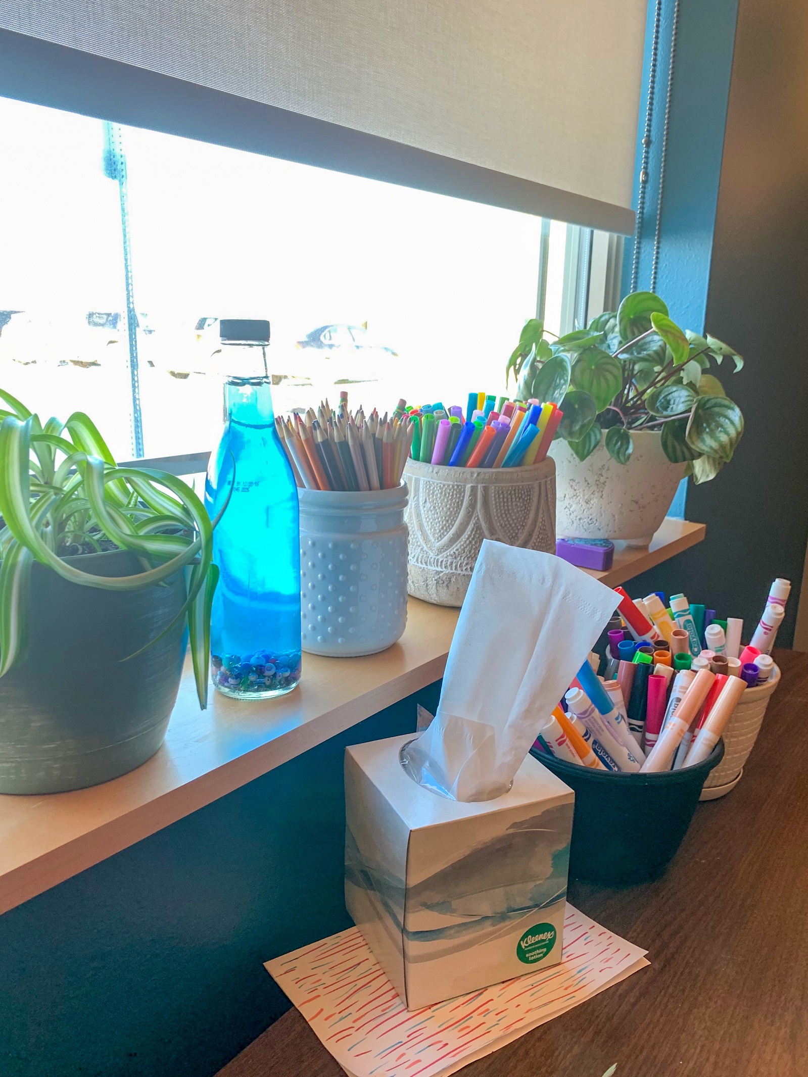 There’s no such thing as a typical session, she says, and not everyone who walks through her door will do art therapy. But integrating art directives into her therapy sessions can help clients open up and begin to process difficult emotions. Art therapy also allows Danielle to gather a lot of information quickly. For example, by asking a child to draw all the members of her family doing an activity, she gets to know more about them and their situation.